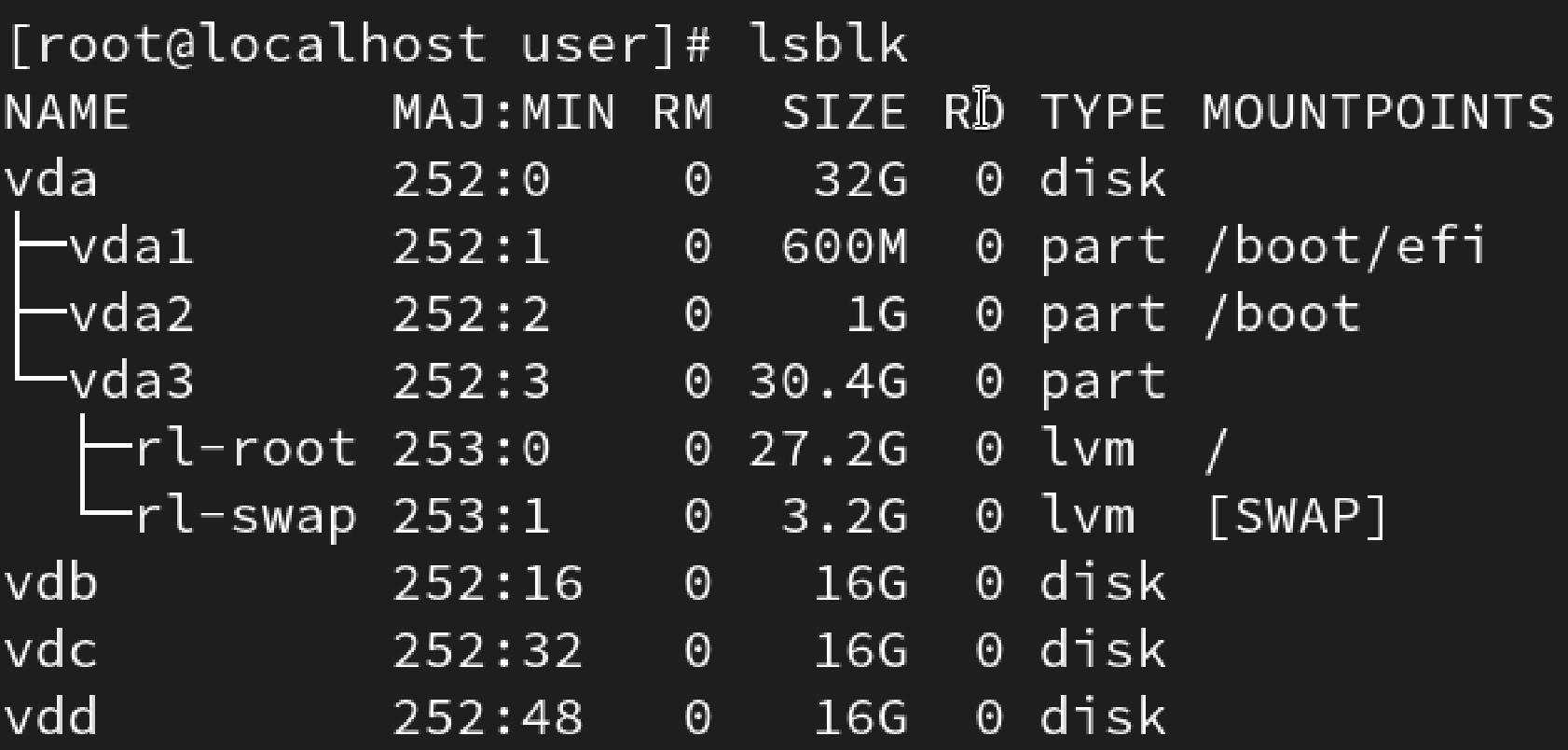 lsblk- 만약에 OS를 설치한 디바이스를 제외하고, 총 세 개의 디바이스를 더 추가했다면 아래와 같이 나올 것