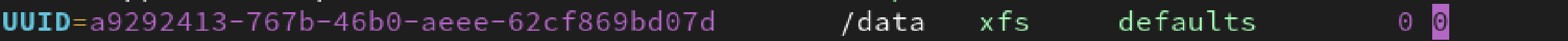 UUID=... /data xfs defaults 0 0| 필드 | 의미 |