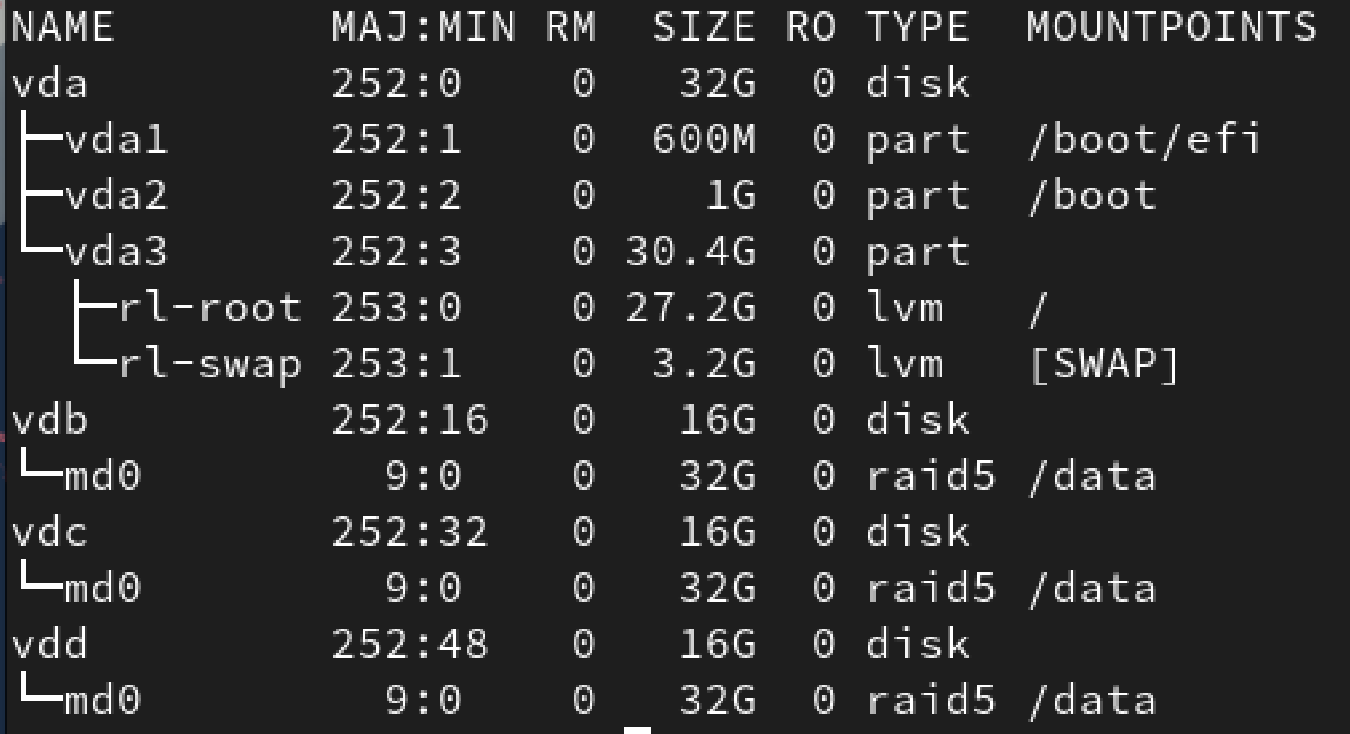 - 현재 OS가 심어져있는 sda 를 제외하고, vdb, vdc, vdd 두 개가 존재하기 때문에 RAID를 설정할 수 있음
