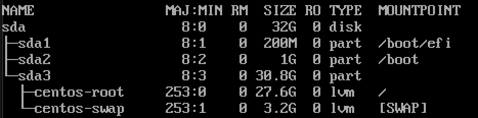 • 여기 보면 첫 번째 디스크 (sda) 가 파티션 세 개로 나뉜 것을 볼 수 있음