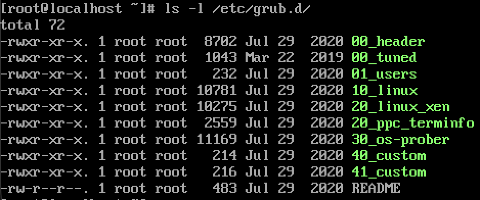 • 수정 가능한 파일들은 grub2-mkconfig 명령을 통해 합쳐져서 자동생성이 되는 파일로 만들어진다.