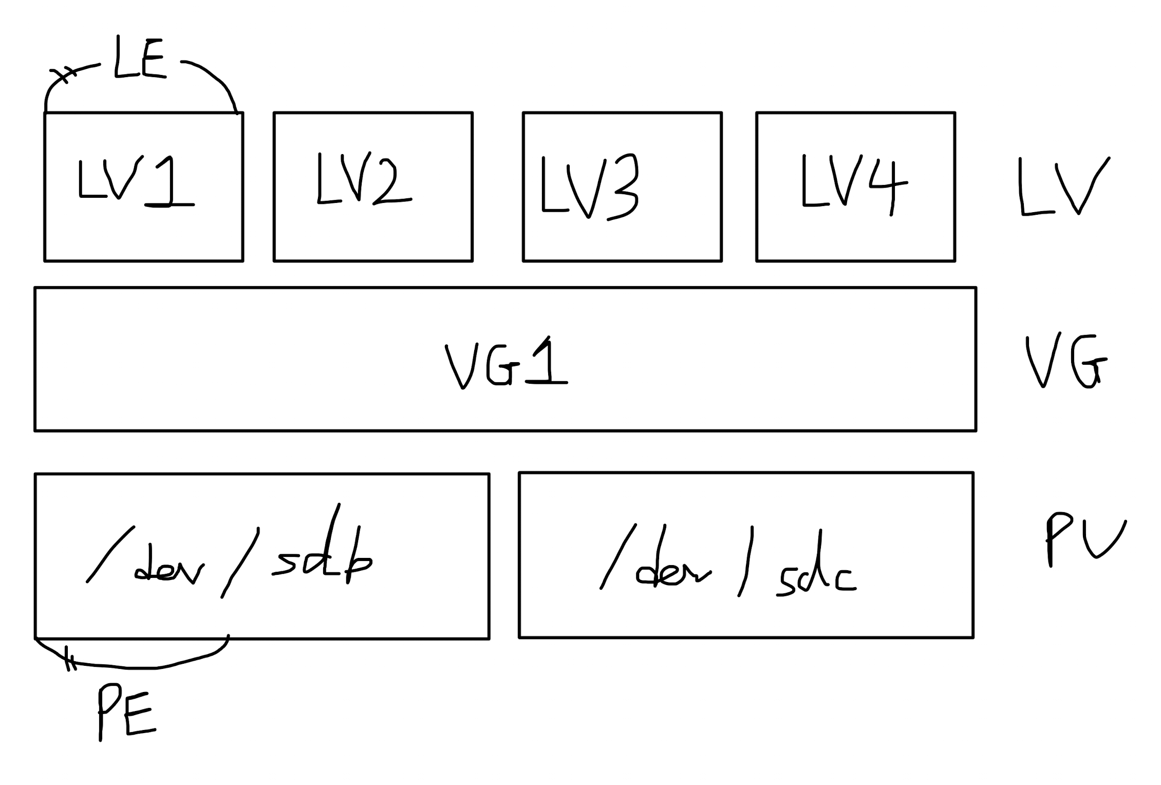 • LE : Logical Extent. LV를 구성하는 일정 크기의 블록인데, PE와 동일한 크기를 가진다.