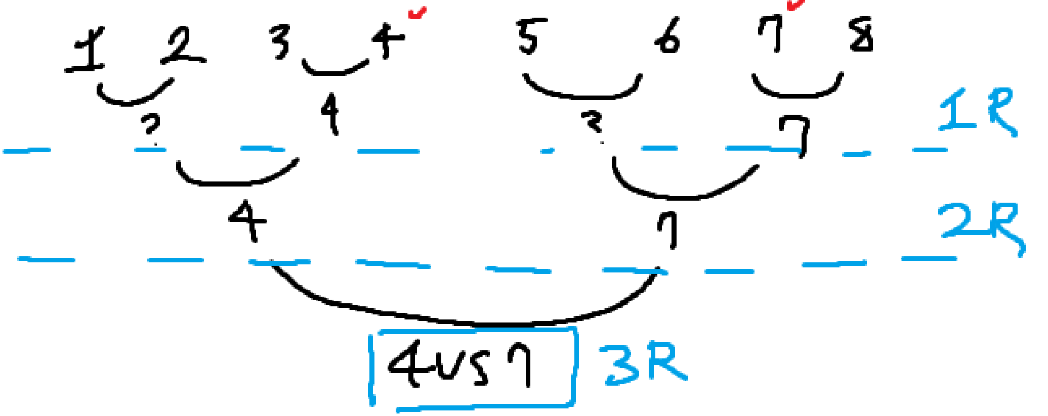 첫 번째 라운드에서 4번 참가자는 3번 참가자와 붙게 되고, 7번 참가자는 8번 참가자와 붙게 됩니다. 항상 이긴다고 가정했으므로 4번 참가자는 다음 라운드에서 2번이 되고, 7번 참가자는 4번이 됩니다. 두 번째 라운드에서 2번은 1번과 붙게 되고, 4번은 3번과 붙게 됩니다. 항상 이긴다고 가정했으므로 2번은 다음 라운드에서 1번이 되고, 4번은 2번이 됩니다. 세 번째 라운드에서 1번과 2번으로 두 참가자가 붙게 되므로 3을 return 하면 됩니다.