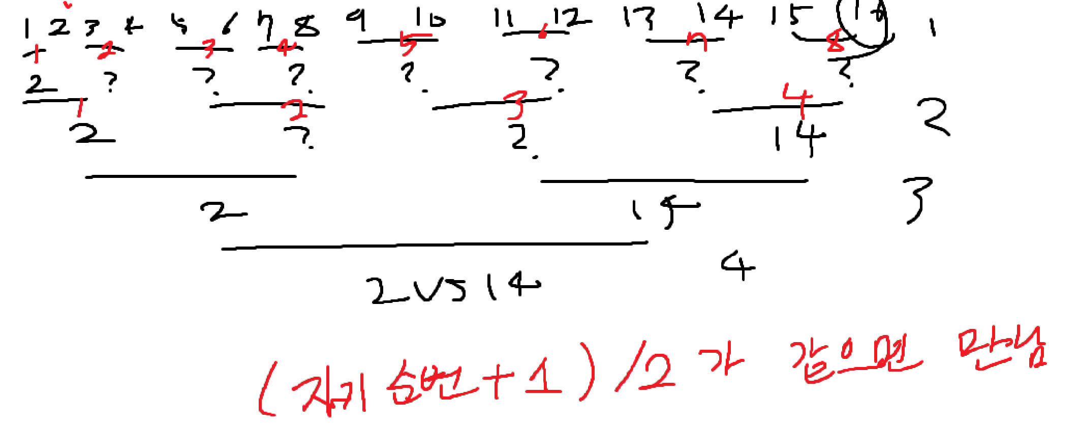int 로 바꾼다고 가정할 때, ((자기 순번 + 1) / 2) 한 값이 같으면 만나게 됨